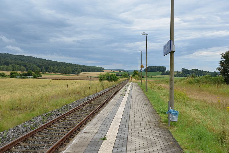 Nicht ganz der genaue Drehort, aber die Strecke ist seit 2018 außer Betrieb und inzwischen teils extrem zugewachsen ! Auch bei folgenden Bildern der Drehorte von damals waren oft Kompromisse nötig, um überhaupt etwas auf das Foto zu bekommen. Ab 0:47:28 kommt der Zug vor einem “Halt” zeigenden Signal zum Stehen. Das Kaninchen entkommt durch eine offene Tür, Harry verfolgt es bis unter den Zug, der dann wieder anfährt — eine Szenenfolge, die bei den heute üblichen Türblockierungen und Niederflurfahrzeugen völlig unmöglich wäre… Diese Stelle liegt bei Kilometer 85,5 beim Weiler Leitl.