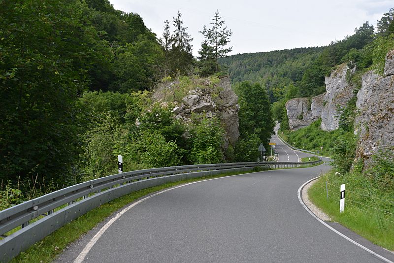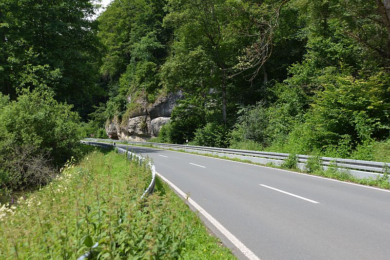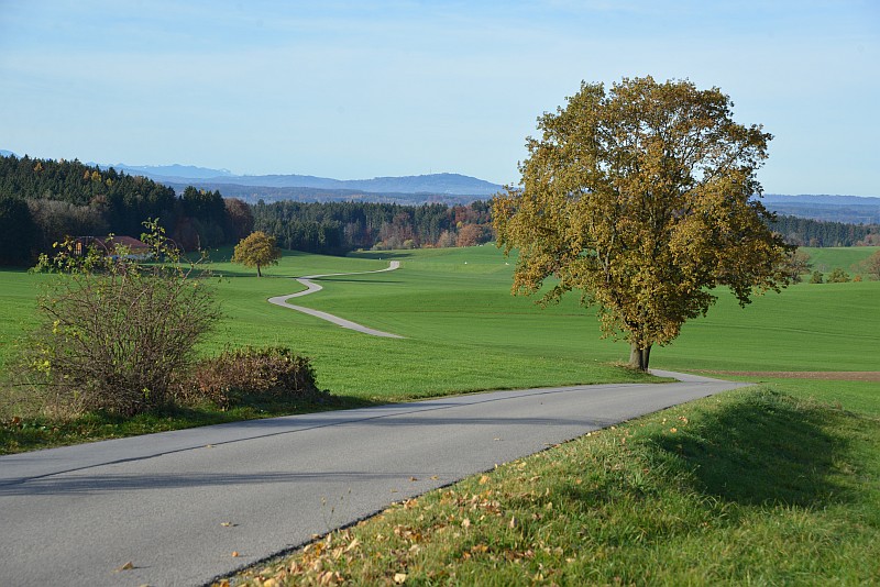 Eder und sein Kobold fahren aufs Land. Auf einem einsamen, geschwungenen Sträßlein darf Pumuckl auch einmal selber steuern. Die Straße führt von Degerndorf hinüber zur St 2065 bei Oberambach.
