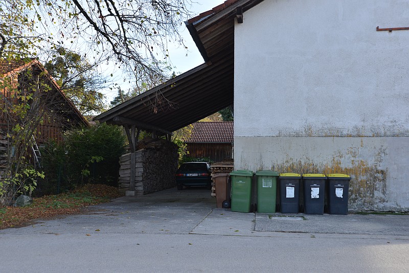 Fans des Krimi-Ulks “Hubert und / ohne Staller” kennen jeden Meter von dem Sträßlein, hier wurden viele Szenen gedreht. Auch Jean-Paul Belmondo war hier schon unterwegs ! Pumuckl bringt den Maibaum in “Sicherheit” Die Szenenfolge vom Versteck des geklauten Maibaumes bis zu dessen Versenkung entstand in / bei Degerndorf. Das Traktor / Maibaum Gespann steht gut verborgen halb in einem Schuppen & zwischen den verschachtelt stehenden Nebengebäuden des Anwesens Sonderhamer Weg 5. Pumuckl wirft den Traktor an, legt einen Stein auf´s Gaspedal und rammt etwas grobmotorisch den Gang hinein. So rumpelt er gleich nach wenigen Metern durch das geschlossene Schuppentor, und weil es gar so schön ist, wird gleich noch die Wäscheleine abgeräumt. Im Anschluß fährt er mit dem Traktor und dem Maibaum auf einem Hänger durch Degerndorf. Zuerst geht es den Kirchberg entlang … …. wo ein paar Mülltonnen am Straßenrand stehen ….