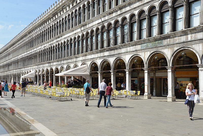 Tilda & Amandus beim Eisessen auf dem (trockenen) Markusplatz … 1:50:27 hier zur Abwechslung die Variante mit dem beginnenden “Aqua Alta”; dezent drückt das Wasser durch die Gullys nach oben….