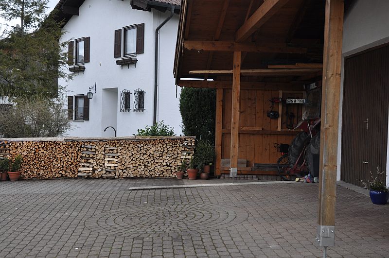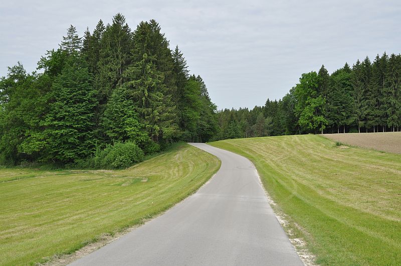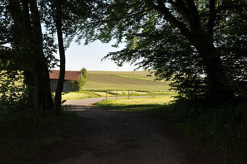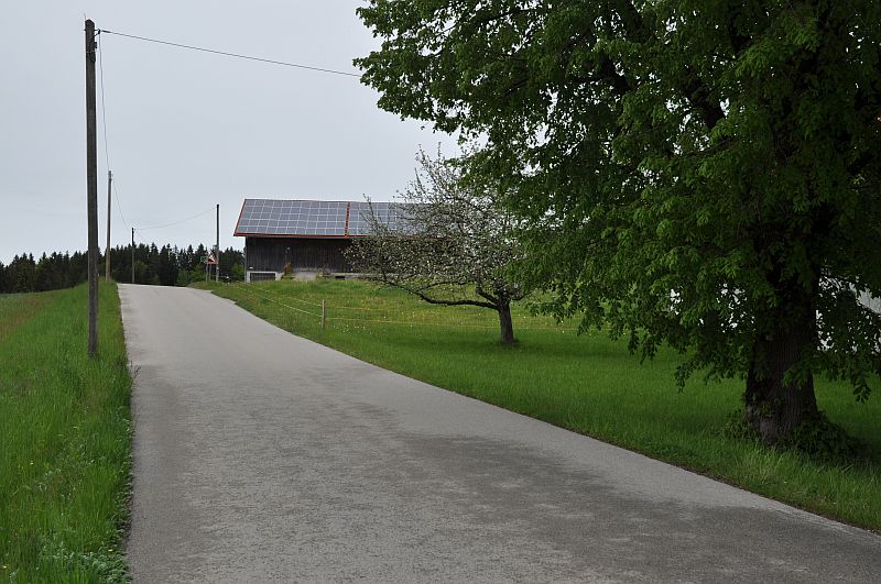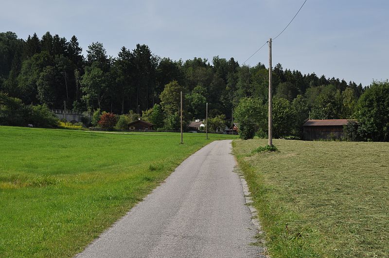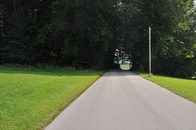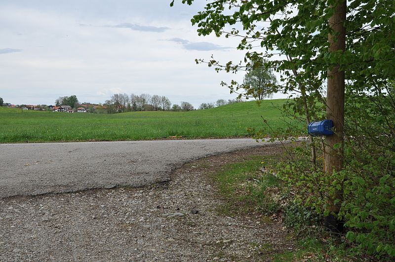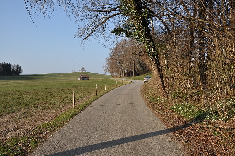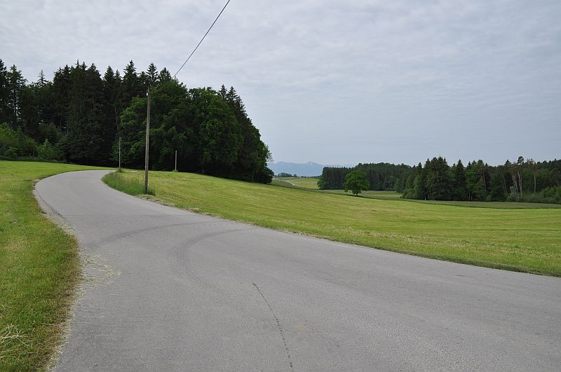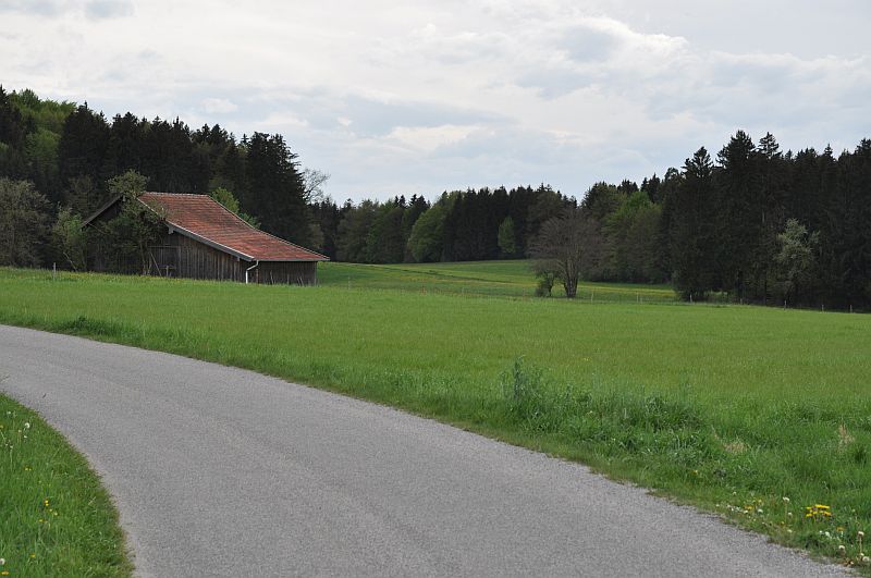 Gerade in Hofstätt von der St 2064 abgebogen, demonstriert Hubsi seinem Beifahrer Reimund , wie sich Zubereitung & Verzehr einer WLKS (warme Leberkässemmel) sowie Lenkung eines Kraftfahrzeuges problemlos vereinen lassen. 125 ab 15:25 In Folge 106 überholt hier Hubert Staller, der Riedls Fahrrad ausgeliehen hat. Der Schuppen etwa in Bildmitte stand zum Zeitpunkt der Dreharbeiten noch nicht. Wenn dann in Folge 144 Riedl im Audi Abschlepphilfe für Girwidz im Geländewagen des Opfers leistet, ist der Schuppen noch ganz neu.