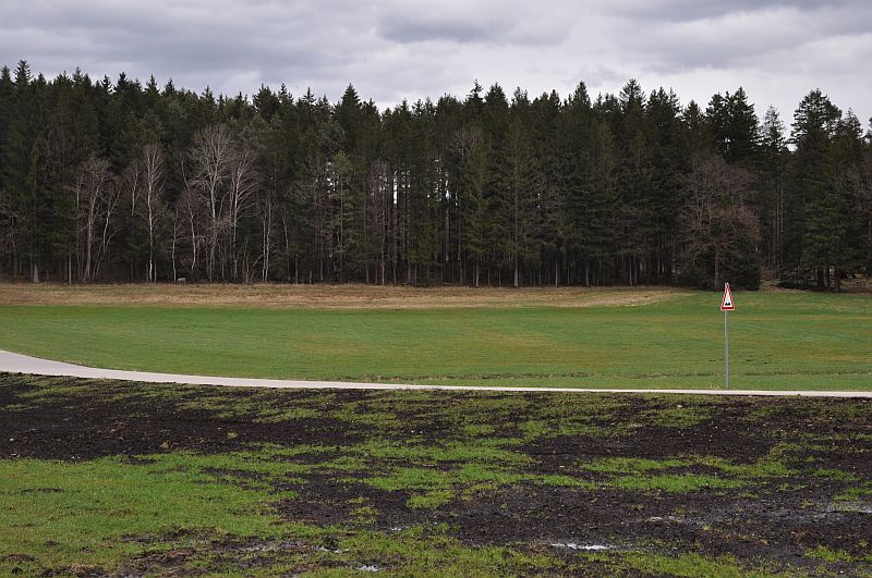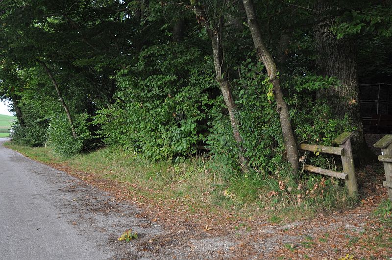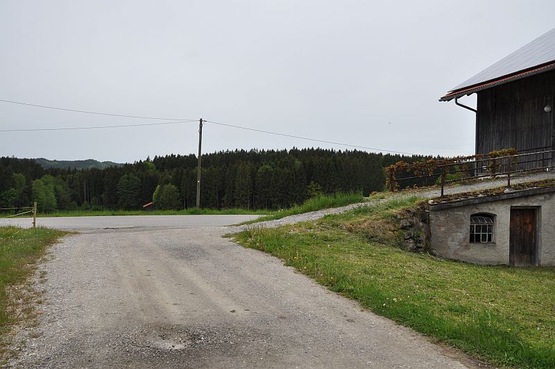Wenn man an der Kreuzung in östlicher Richtung fährt, endet das Sträßlein im Weiler Babenstuben; das ist der Biohof aus Episode 026, dessen an Narkolepsie leidender Besitzer mit dem Nachbarn im Streit liegt, und in seiner eigenen Odelgrube ertränkt wird. Der Hof ist Privatgelände: Ein Dankeschön an die Besitzerin, die mir die Fotos erlaubte – auch wenn der Hund ganz anderer Ansicht war… Bei 18:31 hört Hansi irgendwo gedämpft ein Handy läuten.