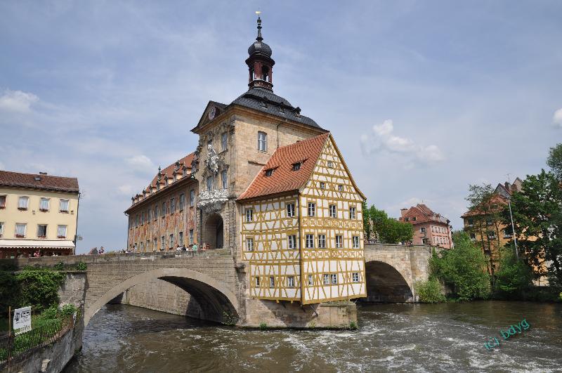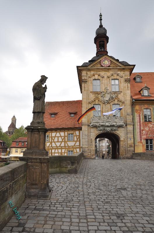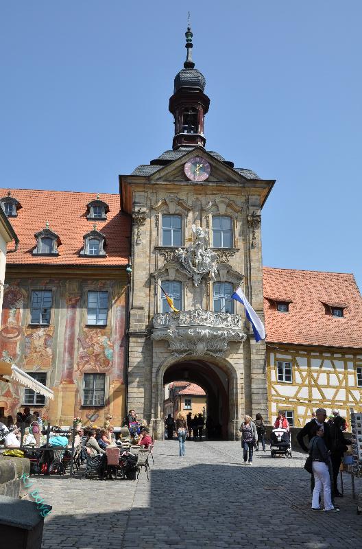 Das pittoresk auf einer Insel in der Regnitz gelegene Alte Rathaus stellt die unmittelbare Nachbarschaft der Musketierunterkunft dar.
