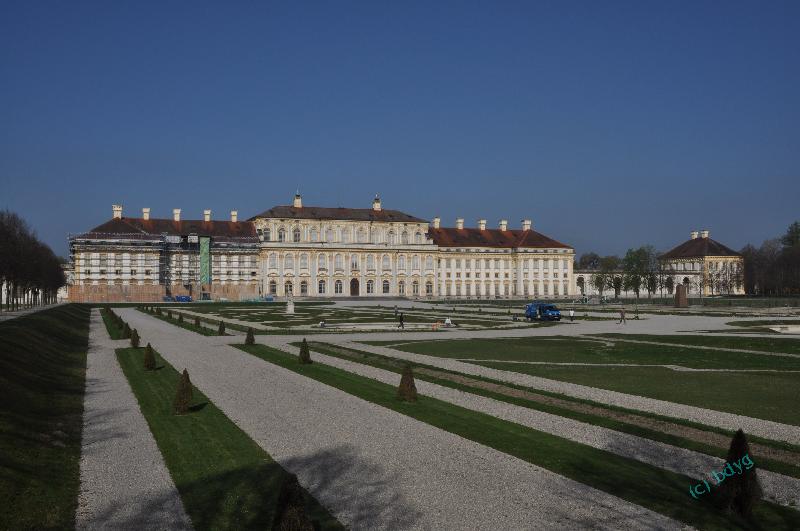 1704 war der Corps de Logis sowie der südliche Pavillon mitsamt der Verbindungsgalerie ganz, der nördliche Pavillon teilweise im Rohbau fertig – dann verlor Bayern an der Seite der verbündeten Franzosen die Schlacht bei Höchstadt (Spanischer Erbfolgekrieg);